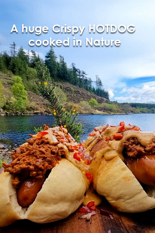 A huge crispy HOT DOG cooked in nature by the River